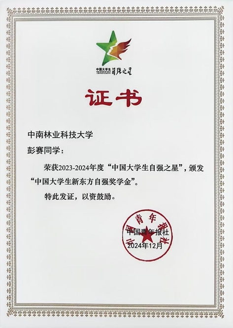 近日,由共青团中央、全国学联指导,团中央基层建设部、中国青年报社主办的2023-2024年度“中国大学生自强之星”奖学金推选结果揭晓,我校彭赛同学在众多学子中脱颖而出,获评“中国大学生自强之星”荣誉称号,并荣获“中国大学生新东方自强奖学金”。