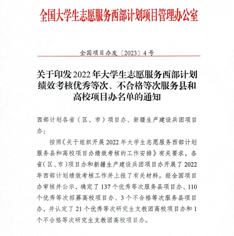 近日,全国大学生志愿服务西部计划项目办发文公布了2022年大学生志愿服务西部计划高校项目办绩效考核名单,全国共有110个高校、湖南省共有4所高校获此荣誉。我校项目办(挂靠校团委)被评为优秀等次。
