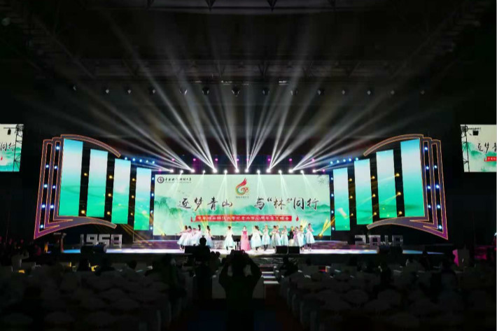 晚会以“逐梦青山,与‘林’同行”为主题,分为“初心之路”“甲子芳华”“绿色使命”三个篇章,绘就了学校60年砥砺前行的长图阔卷,展现了我校不忘初心忆甲子,牢记使命再出发的信念情怀。节目形式丰富多样,古琴与史诗的对话、歌曲联唱、校友现场访谈、大型情景舞蹈剧、新民乐、侗族情景歌舞剧、诗朗诵等,为在场观众带来了一场独具匠心的视听盛宴。