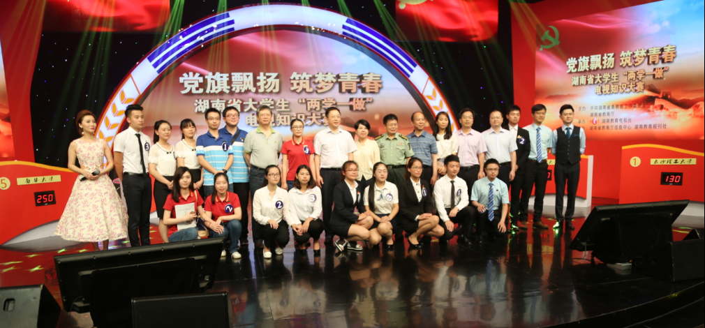 “党旗飘扬 筑梦青春”——湖南省大学生“两学一做”电视知识大赛由省委教育工委、省教育厅主办,湖南教育电视台承办。全省共有40所高校组队参赛,初赛分八场进行,每场五支队伍,第一名进入复赛。我校与湖南师范大学、长沙理工大学、吉首大学、南华大学在第一组竞赛。经过90分钟的激烈角逐,我校以260分的总分获得小组第一。