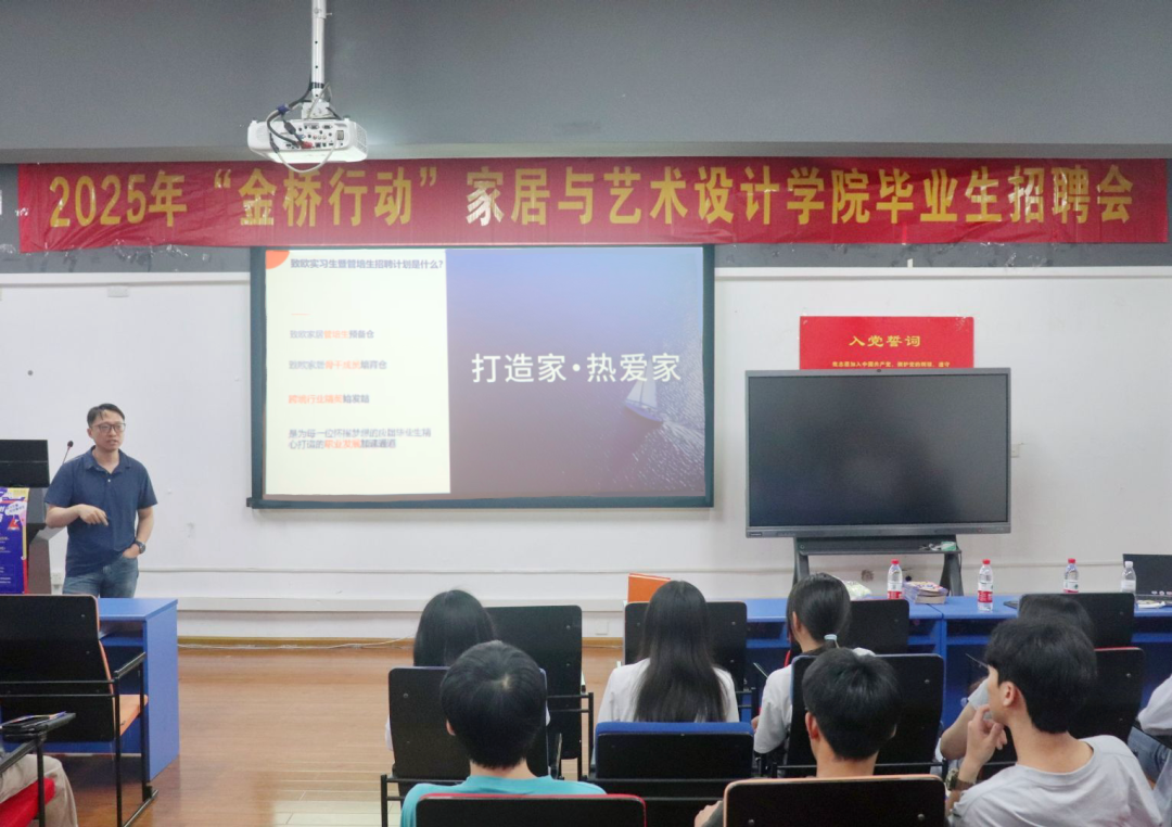 5月19日,家居与艺术设计学院在匠心楼举行“金桥行动”毕业生专场招聘会。致欧家居人力资源总经理钟其喆、招聘负责人宾晓龙等一行四人,学院党委书记许桂梅、副书记张广酃、辅导员梁智娇、张曦文出席会议。