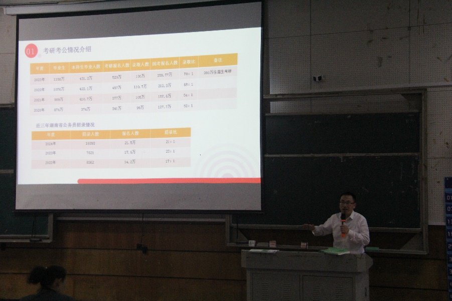 活动伊始,付湘晋为同学们作考研、就业情况报告。他指出,近年来考研、考公的人数总体呈逐年上升趋势,希望同学们提早备考,同时着重关注秋招和春招,全方位的为就业做足准备,并为21级同学们送上真挚的祝福。