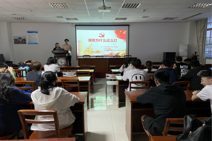 活动首先由学校习近平新时代中国特色社会主义思想研究社宣讲员许婷为大家做“湖南为什么这么红”主题宣讲,从心忧天下的爱国情怀、实事求是的务实作风、敢为人先的创新精神、敢于牺牲的斗争精神四个方面讲述了湖南人民在党的领导下为共产主义事业不懈奋斗的过程,充分展示了湖南党史军史人物的光辉事迹,加深了同学们对湖南人民进行革命斗争的艰辛历程的了解。