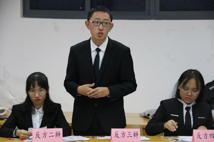 双方队员进行自我介绍之后,便简明扼要的向评委和现场观众们阐明己方观点。在自由辩论环节中,正方从当前立法惩戒机制的缺失方面向反方提出质疑。反方选手冷静应对,以教育引导仅停留在道德层次,未能使施暴者承担与后果相匹配的恶果为突破点进行反驳。正反双方才思敏捷、引经据典,赢得现场观众阵阵掌声。