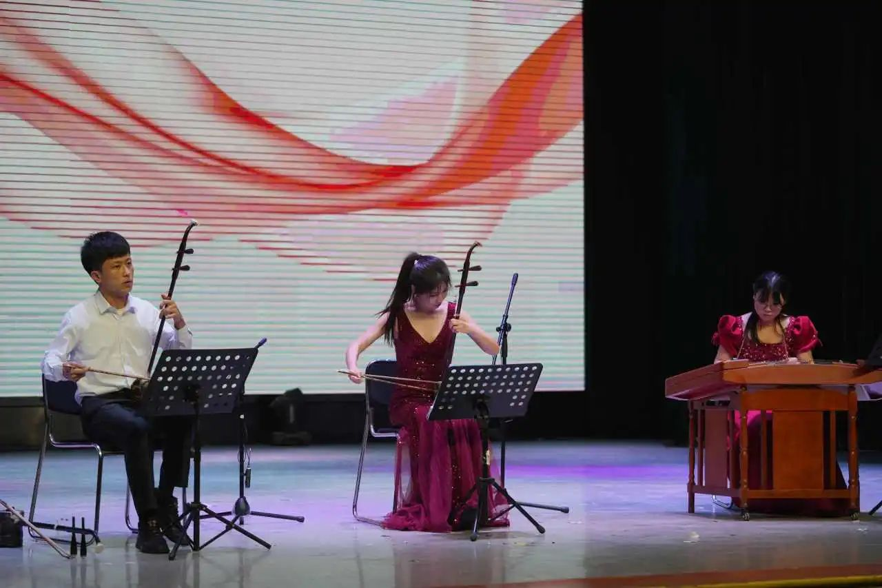本场演出通过多元节目来展现生态艺术的创新表达:民乐重奏《迎宾曲》以欢快旋律拉开序幕,群舞《醉春风》以灵动舞姿勾勒春日画卷;重奏《红丝绒》用柔美的音色展现浪漫与深情;独舞《请别拿走》用肢体语言传递深沉情感;重奏《映山红主题随想曲》以经典民歌《映山红》为基调焕发新意;重唱《西风》是一位女性的叙事;独唱《钗头凤》诠释了陆游与唐婉的凄美爱情;合唱《小雅鹿鸣》以古朴旋律还原先秦礼乐之美;独舞《牧民心歌》包含了牧民生活的纯朴与豪迈;独唱《我的爱人你可听见》深情款款;原创作品《饮》则借陶渊明诗意抒写田园情怀;西方钢琴名曲《肖邦第三谐谑曲》与民族舞蹈《马铃摇起幸福歌》同台辉映,展现东西方艺术对话的魅力;合唱《稻鱼》旋律清新自然,充满生机与和谐。